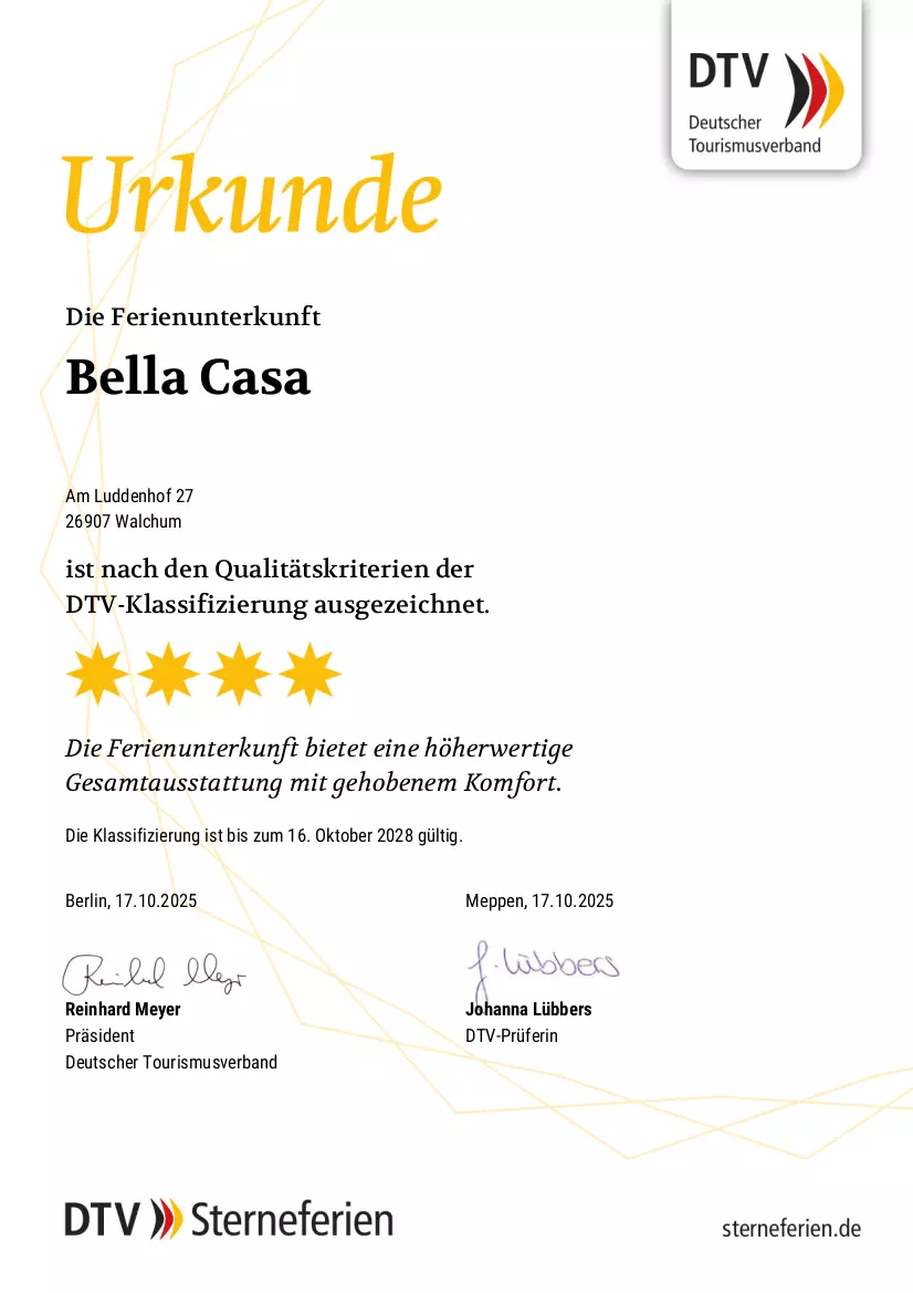 Das Ferienhaus Bella Casa im Ferienpark Am Luddenhof in Walchum ist ein Walmdachbungalow, welcher im Jahr 2025 fertig gestellt worden ist.