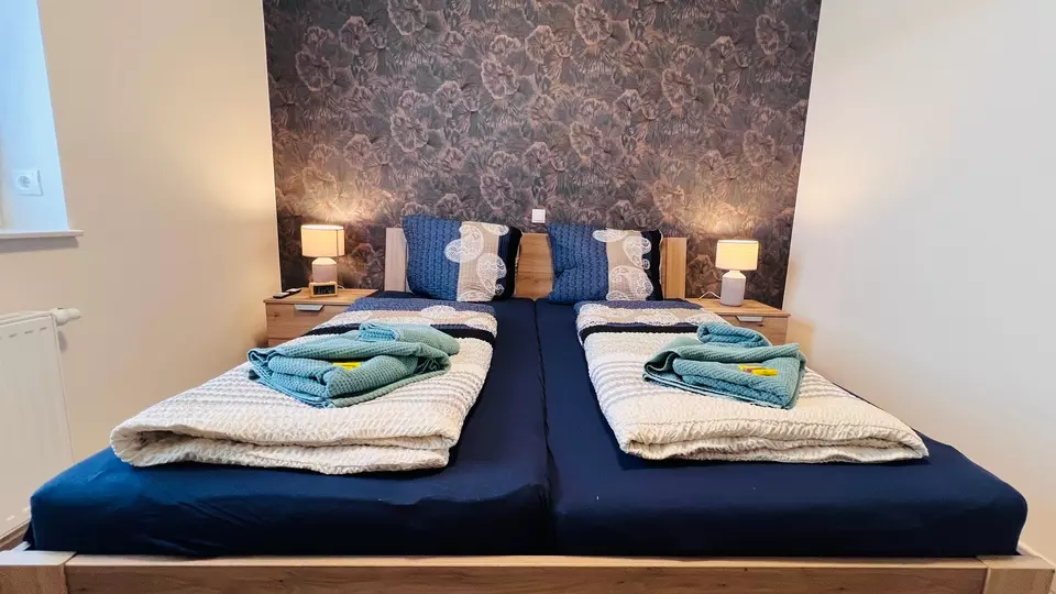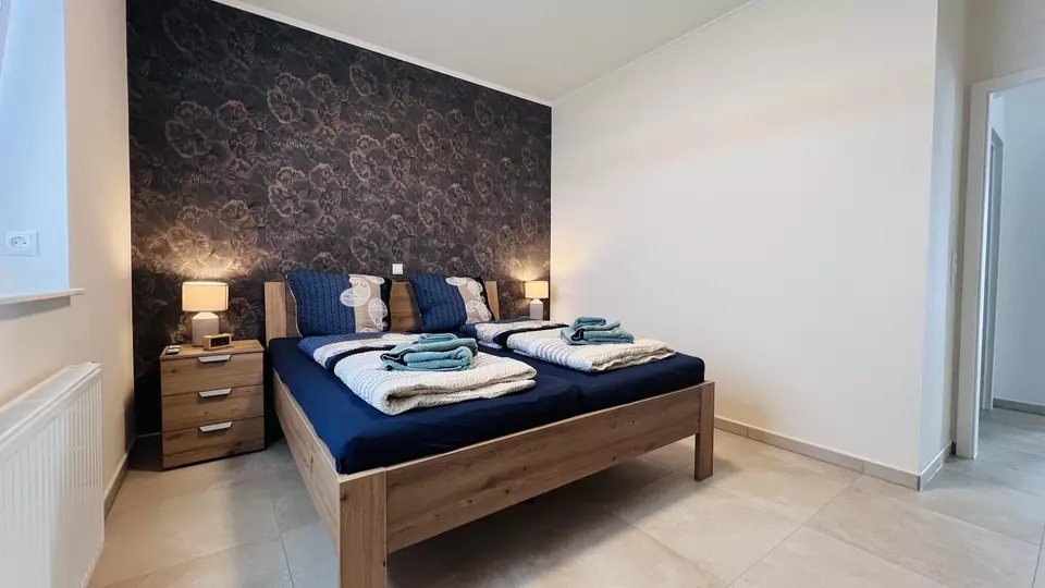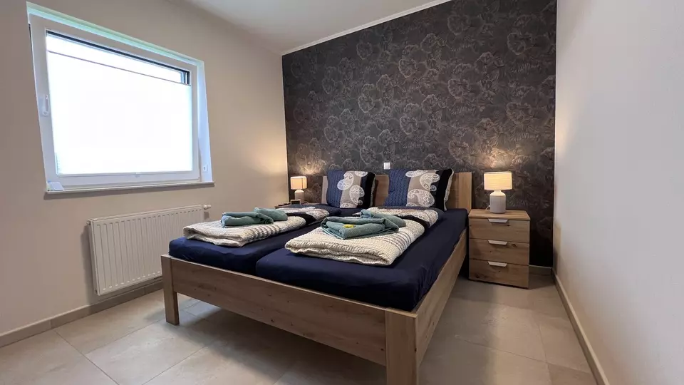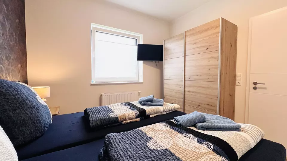 Die Wohnfläche im ebenerdigen Haus beträgt ca. 80 qm. Die maximale Belegung ist für 4 Personen angelegt. Sie haben zwei Schlafzimmern zur Verfügung - jeweils mit einem Doppelbett (180 x 200 cm) und einem Kleiderschrank. Für Kleinkinder steht ein Kinderreisebett zur Verfügung. In allen Schlafräumen sind Fernseher vorhanden.
