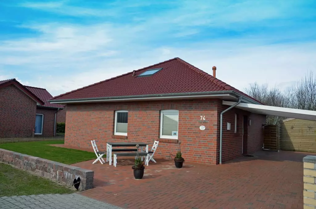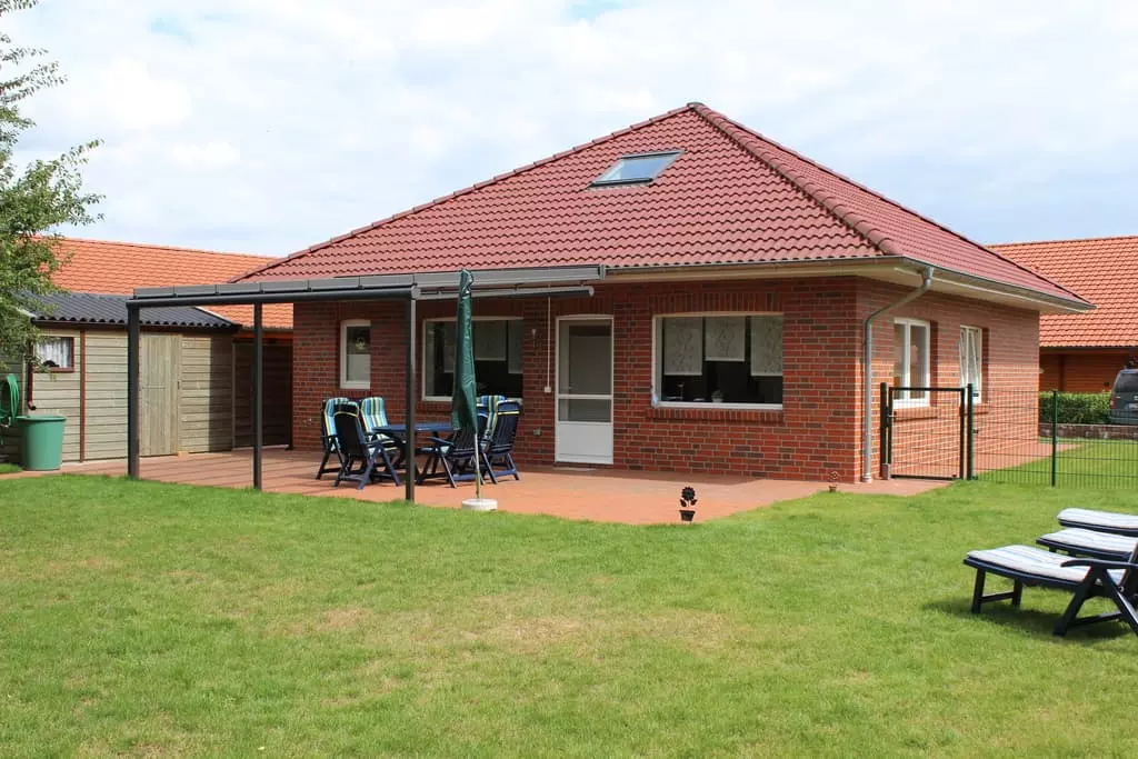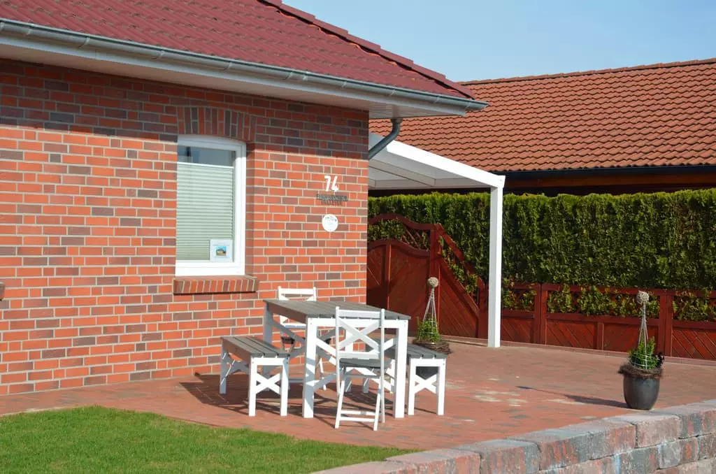 Zu dem Ferienhaus gehört ein eigener Garten sowie eine Terrasse. Die Terrasse verfügt über eine Überdachung mit elektrisch herausfahrbarer Beschattung. Die Überdachung hat eine Größe von rd. 20 qm. Die Terrasse ist mit Gartenmöbeln ausgestattet.
