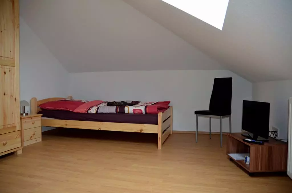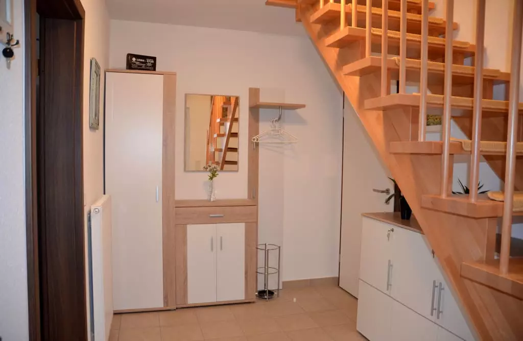 Die maximale Belegung des Ferienhauses beträgt 6 Personen + (1 Kind bis max. 4 Jahre im Kinderbett). Zwei von drei Schlafzimmern befinden sich im Obergeschoss. Das Schlafzimmer im Erdgeschoss hat ein Doppelbett (180 x 200 cm), einen Kleiderschrank und ein zusätzliches Kinderbett.